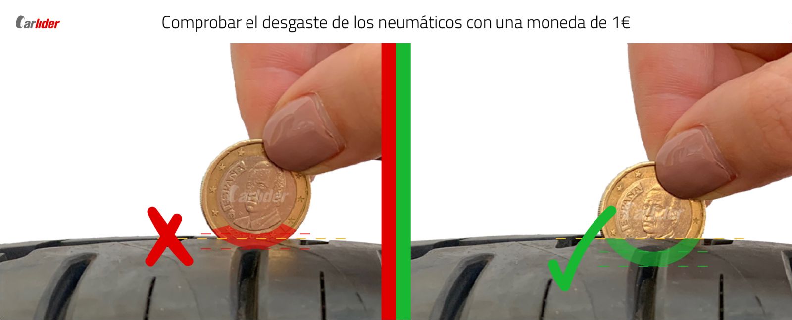 Asegúrate de que la profundidad del dibujo no haya alcanzado el mínimo legal de 2mm, puedes comprobarlo con una moneda de 1€, si la parte dorada es visible, debes sustituir urgentemente los neumáticos: